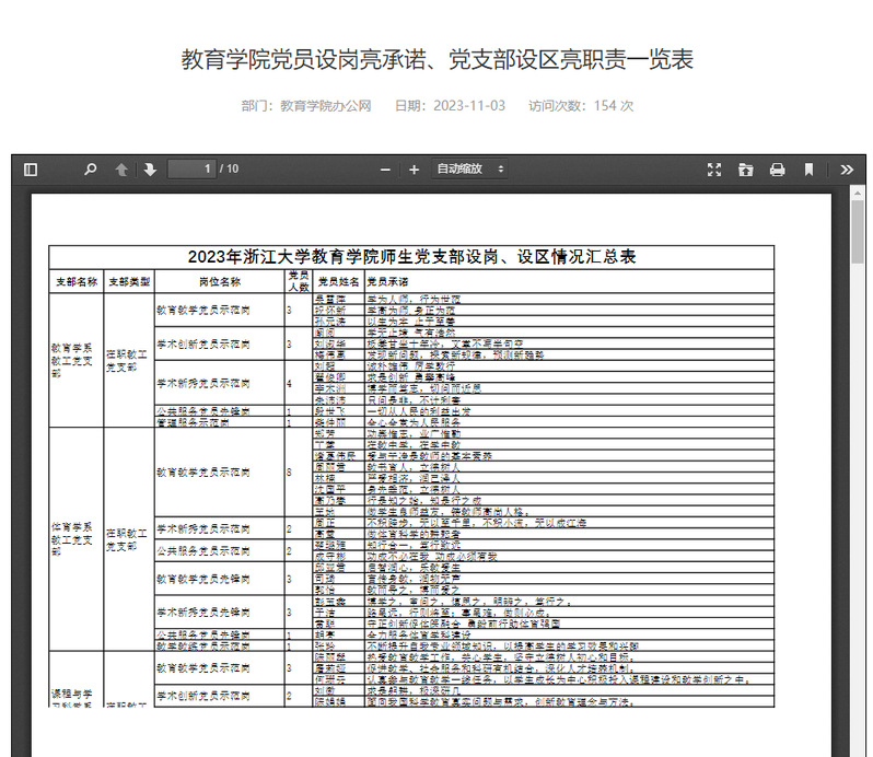 学院办公网公布的党员设岗亮承诺、党支部设区亮职责一览表