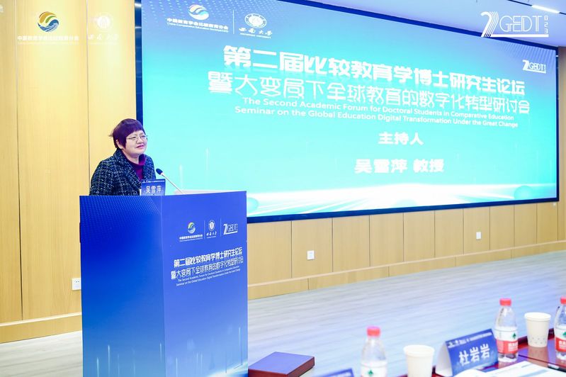 为分析全球教育数字化转型新趋势,促进各高校比较教育学专业博士研究生学习交流,12月16日至17日,由中国教育学会比较教育分会主办、西南大学教育学部承办的第二届比较教育学博士研究生论坛暨“大变局下全球教育的数字化转型”研讨会在西南大学召开。中国教育学会比较教育分会秘书长、北京师范大学教授滕珺主持论坛开幕式,西南大学党委常委、副校长周光明发表致辞,中国教育学会比较教育分会理事长、北京师范大学国际与比较教育研究院院长刘宝存,中国教育学会比较教育分会副理事长、东北师范大学国际与比较教育研究所所长饶从满,教育部高等学校教育学类专业教学指导委员会副主任、西南大学原副校长陈时见做大会学术主旨报告。来自全国40余所高等院校、科研机构、中小学校、期刊出版机构的200余名专家学者和博士研究生参加了此次论坛。浙江大学教育学院吴雪萍教授、段世飞副研究员以及部分博士、硕士研究生参加了本次研讨会。