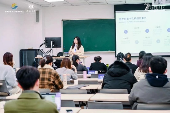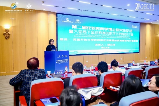 我院比较教育学专业博士生裴文洁在博士生大会报告上作了《英文开放大学教师微证书课程的实施路径与价值意蕴》的主旨汇报,博士生方洁、卢宇峥、周淑怡、朱思晓、马萧萧、宋宇、张晓超、赵紫睿在平行论坛分别作了《开放教育资源视角下的跨境教学资源获取——基于教育国际“教育和版权”研究的分析》《英国高校提升学生数字能力的组织策略研究——基于数字能力框架的分析》《技术赋能:大学开展公共效益服务的路径和机理——以荷兰温特大学为例》《数字化转型背景下俄罗斯成人数字素养评估与提升路径研究》《ChatGPT发展背景下国际化人才培养的范式革命与范式转型》《数字经济时代澳大利亚实施高级学徒制计划的动因及策略——基于技能形成理论的视角》《欧盟职业教育工作者数字素养培育的影响机制研究——基于嵌入性理论分析》《重塑教育未来:美国高等教育数字化转型的动因、行动与挑战》的报告,硕士生钱跳跳在平行会议中作了《全球治理框架下联合国教科文组织推动教师数字能力发展的研究》的报告。