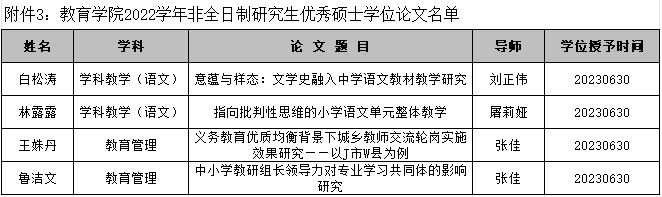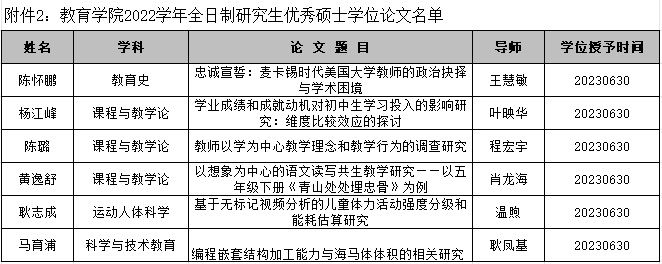 根据《教育学院研究生优秀学位论文评选办法(试行)》,经学科学位评定委员会投票评选通过,共评选出2022学年(2022年9月1日至2023年8月31日)优秀博士学位论文1篇、全日制研究生优秀硕士学位论文6篇、非全日制研究生优秀硕士学位论文4篇,名单详见附件。现将评选结果公示一周,公示期从2023年12月26日起至2024年1月2日结束。公示期内,如对被评选的论文有异议,请拨打联系电话88273714,或将意见或建议发送邮件到jyxy12@zju.edu.cn。