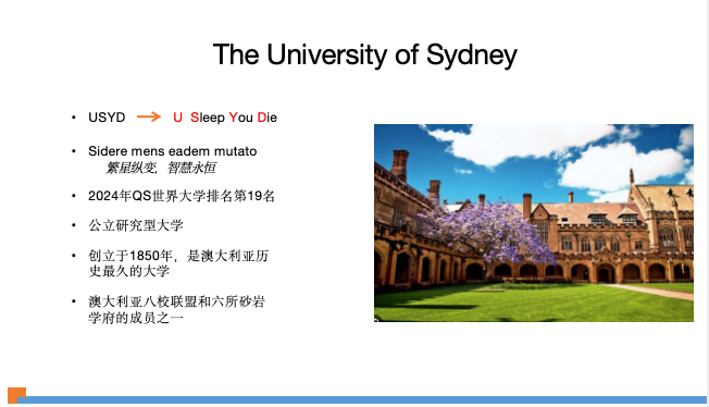 首先,李久彰学长从留学经历、悉尼大学介绍、悉尼生活、生活成本预算、学校申请流程等方面展开经验分享。他介绍,悉尼大学是澳大利亚历史最悠久的大学,具有浓郁的学术氛围、多元化的教学模式、宜人的校园环境等独特优势。此外,他为同学们详细介绍了如何在官网进行学校申请的操作流程,让同学们对悉尼大学有了更全面的认识和了解。