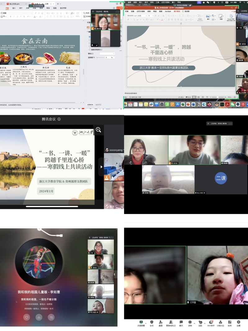 2024年寒假至开学初,浙江大学教育学院教育学本科生第一党支部与贵州湄潭支教团队联合开展“聆听大山学子心声,跨越千里共游书海”系列主题党日活动,发挥支部先锋模范党员和成员的作用,通过一一结对、线上共读一本书的方式,“一书、一讲、一暖”,跨越千里搭建沟通交流的桥梁,让真情在山海间传递,让理想在大山学子心生根,传递故事暖人心。