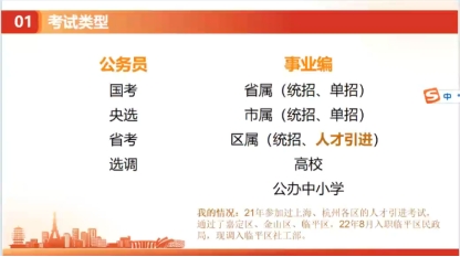 项玲连学姐于21年参加过上海、杭州各区的人才引进考试,成功通过了嘉定区、金山区和临平区的人才引进考试。她建议同学们密切关注报考通知,通过官方网站、官方微信、第三方渠道、学校就业网、就业群等渠道,全面了解相关报考条件,如专业限制、时间节点、考试形式等。在备考方面,对于笔试和面试的准备,可以通过学习课程、做题、模拟考试等方式进行。面试时还需关注时事,保持自信、热情和最佳状态。在择业时,可以从地域、待遇、工作内容、工作时长等方面综合考虑。最后,玲连学姐鼓励大家积极实习,广泛收集信息,根据自身状况做出职业选择。