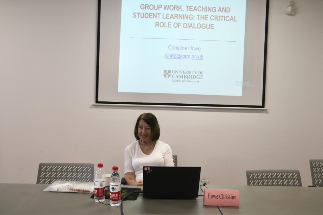5月22日中午,我院青年教师联谊会“青椒汇”系列活动暨教师教学发展系列学术活动在教育学院大楼204教室顺利举行。本次活动邀请了英国剑桥大学教育学院退休教授、Lucy Cavendish学院研究员Christine Howe教授作主题为“小组合作、教学和学习:对话的关键作用”的分享交流。学院课程与学习科学系、教育学系等师生参加此次讲座和交流。讲座由浙江大学教育学院青年教师联谊会会长何珊云老师主持。
