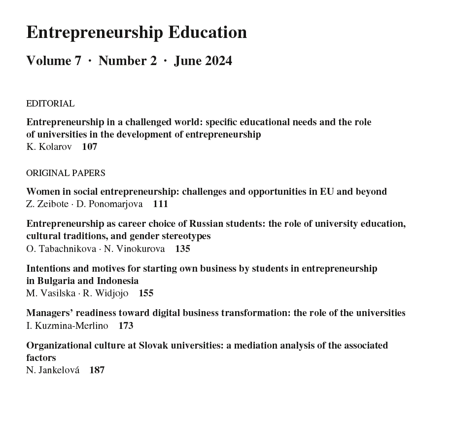 本期《创业教育》以“在充满挑战的世界中创业:特殊教育需求与大学在培养创业精神中的作用”(Entrepreneurship in a challenged world: specific educational needs and the role of universities in the development of entrepreneurship)为主题,与保加利亚国家与世界经济大学(University of National and World Economy)创业研究所合作推出专刊。
