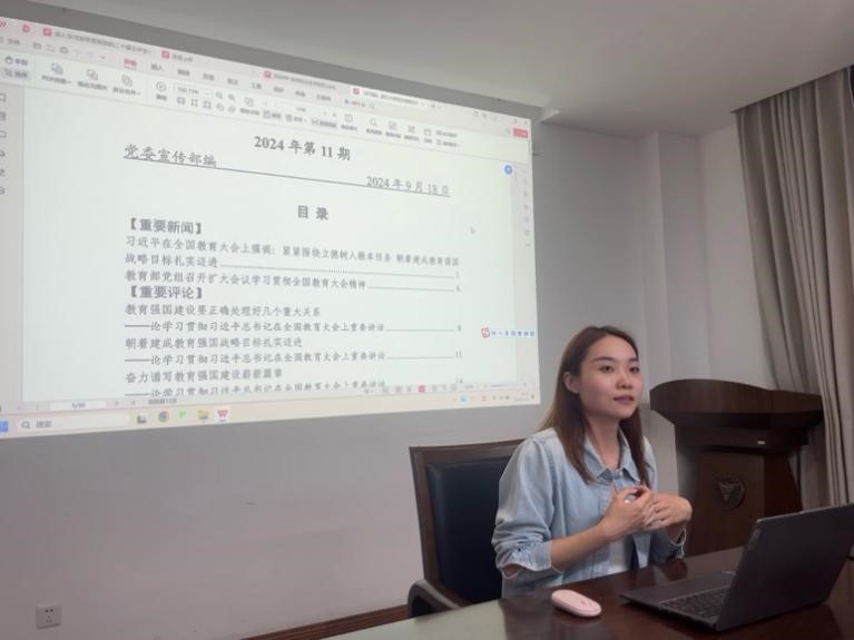 2024年9月21日晚,教本二支部开展党员大会,以“教育强国建设”为主题,集体学习研讨党的二十届三中全会精神和全国教育大会精神,并对支部党纪学习教育开展情况进行了总结。教本二支部全体党员参加了本次会议。