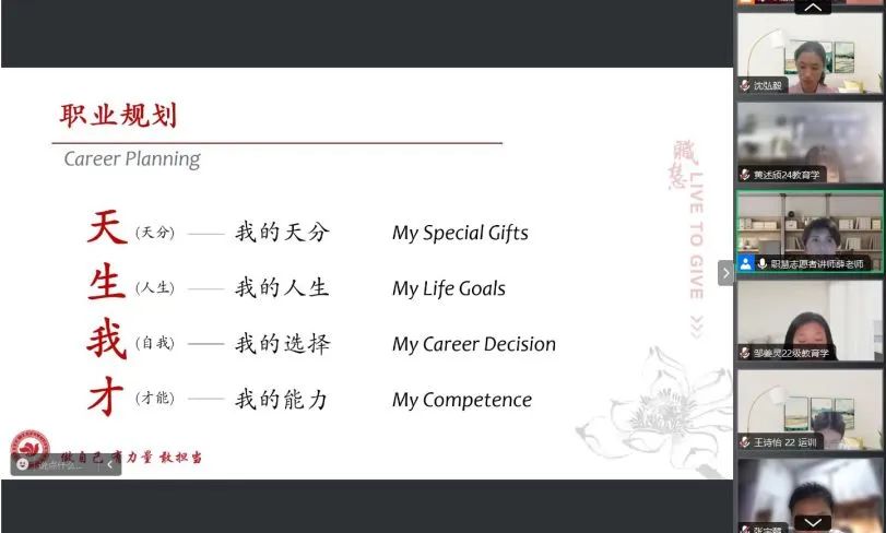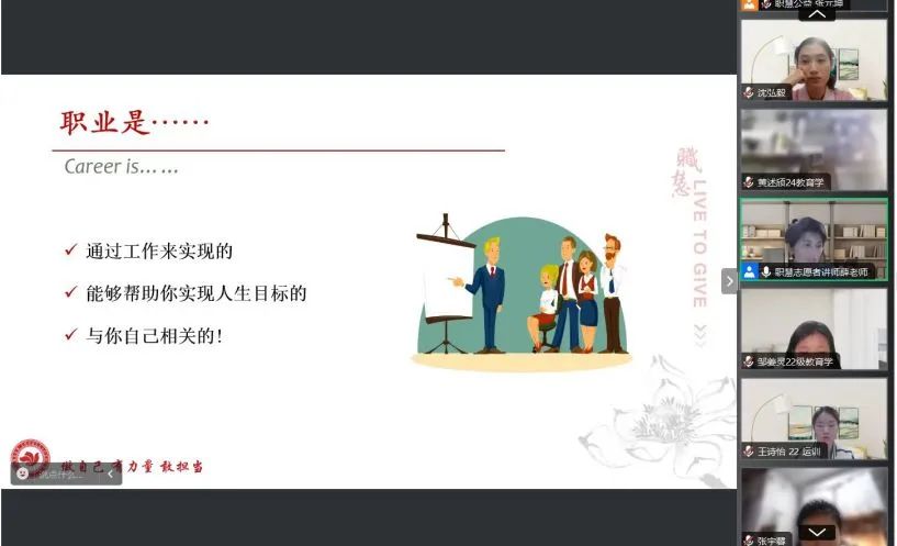 2024年10月12日晚,教育学院“E路启程”就业系列活动——职慧课程之职业规划活动通过腾讯会议平台在线上顺利举行。本次课程邀请了具有丰富职业规划经验的职慧志愿讲师薛芳妮老师。通过线上讲解,薛老师简明扼要地向同学们分享了职业规划的核心。