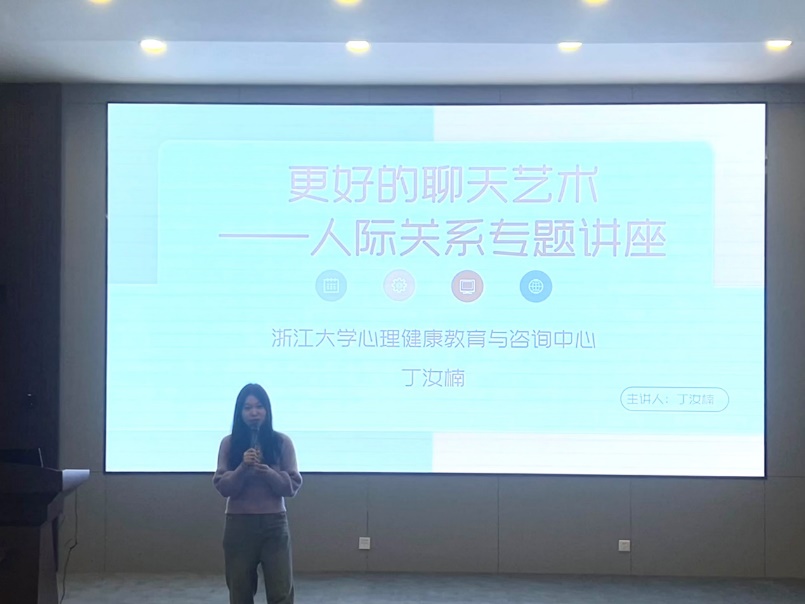 2024年10月25日下午,教育学院2024年度“心晴四季”系列活动:更好的聊天艺术——大学生人际沟通专题讲座在教育学院118报告厅举办。本次心理活动邀请到浙江大学心理健康教育与咨询中心丁汝楠老师与同学们交流分享,在人际关系的作用、意义、困惑以及如何建立和维护人际关系等方面为同学们提供了一些经验和指导。