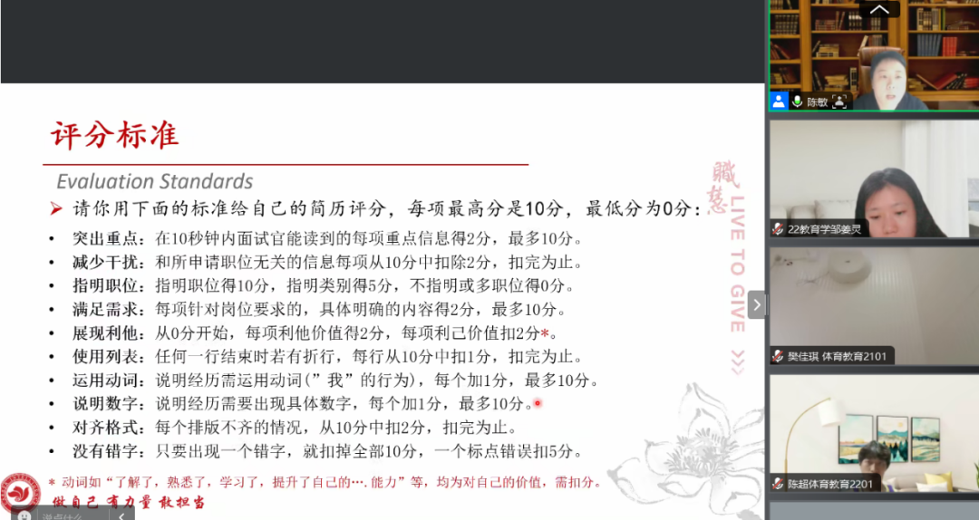 2024年10月20日晚,教育学院就业系列培训活动——“职慧课程之简历制作”讲座通过腾讯会议平台在线上顺利举行。本次课程邀请了具有丰富简历制作经验的职慧志愿讲师陈敏老师,通过线上讲解,陈老师深入且透彻地向同学们分享了简历制作的核心与重点。