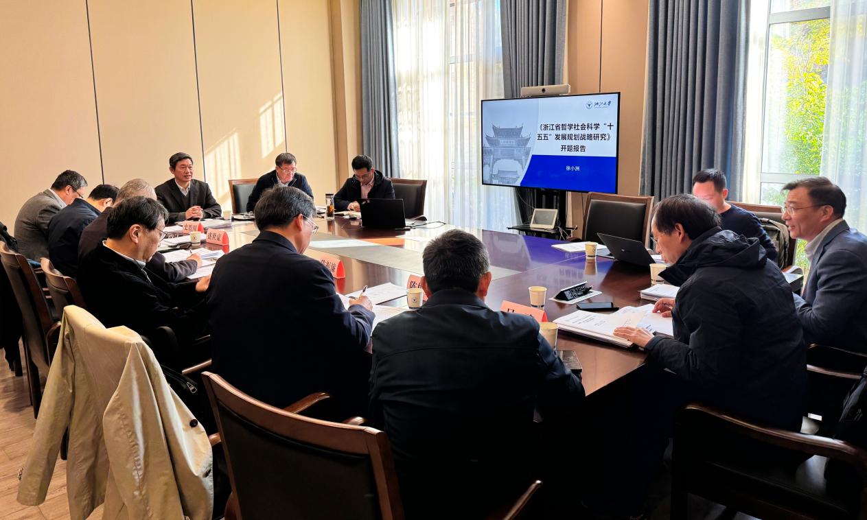11月29日下午,浙江省哲学社会科学规划重大委托课题《浙江省哲学社会科学“十五五”规划战略研究》开题评审暨专家咨询会在浙江大学紫金港校区顺利举行。开题咨询专家组由中国文联副主席陈振濂、浙江省社会科学界联合会主席盛世豪、浙江省人大常委会委员、教科文卫委会员主任委员陈根芳、浙江大学文科资深教授史晋川、浙江大学公共管理学院教授余逊达、浙江大学传媒与国际文化学院教授吴飞等组成,余逊达教授担任专家组组长。课题组总负责人徐小洲教授、阚阅教授,以及6个子课题负责人等课题组成员约20余人参加会议。