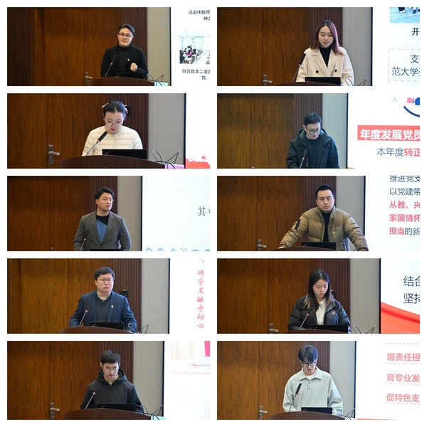 在述职会上,学院15个师生党支部书记依次上台述职,逐一汇报过去一年各支部在党建与业务融合互促、思想建设、组织建设、政治建设、纪律建设等方面的基本情况,分享开展支部工作的经验与做法,总结剖析存在的不足并提出改进方向。省研究生样板党支部、教育学科研究生第一党支部书记段世飞从支部政治功能和组织功能发挥、学习贯彻重要会议精神、“四个共同体”建设等方面回顾了过去一年支部的工作,分享了支部建设使命引领型样板党支部的特色做法;校样板党支部、机关党支部书记崔倩从支部争当“五个表率”出发,回顾了过去一年支部在政治建设、教育党员、服务师生、文化建设、自身建设等方面开展的工作;校样板党支部、教育学本科生第一党支部书记吴春霆指出,支部积极探索“德育共同体、学习共同体、发展共同体、文化共同体”建设路径,引领学生做美育心灵同行者、美丽中国行动者、美好祖国奋斗者、美好支部共建者。