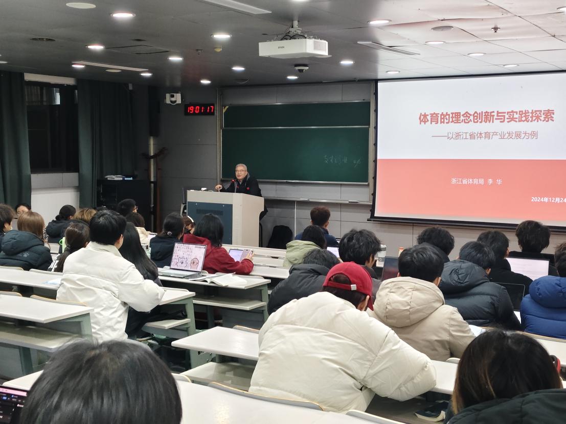 12月中旬,浙江省体育局副局长李华先生以“体育的理念创新与实践探索——以浙江省体育产业发展为例”带来主题讲座。他以浙江步道为例,展示了浙江省体育产业融合的前瞻性和执行力。李局长凭借多年行政管理经验,详细解读国家体育政策,并用生动案例讲述了体育与旅游、文化、科技等产业的融合,以及体育赛事、场馆、制造等领域的创新发展。课程结束后同学们积极提问,围绕体育产业趋势等话题展开了热烈讨论。
