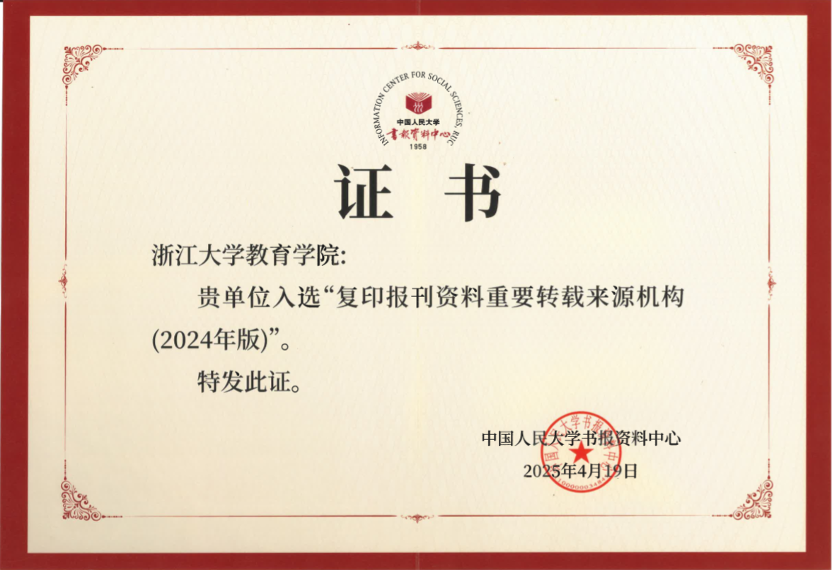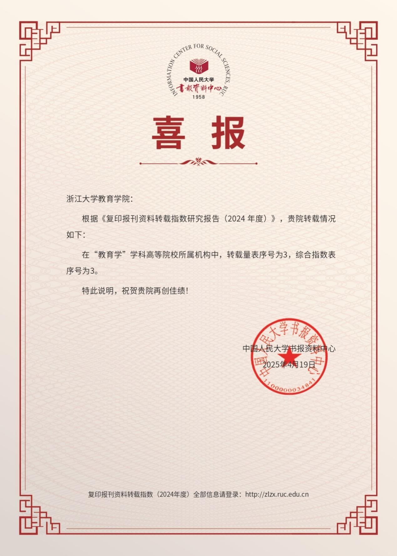 2025年4月19日,中国人民大学书报资料中心发布《复印报刊资料转载指数研究报告(2024年度)》,浙江大学教育学院入选“复印报刊资料重要转载来源机构(2024年版)”,在“教育学”学科高等院校所属机构中,转载量表序号为3,综合指数表序号为3。