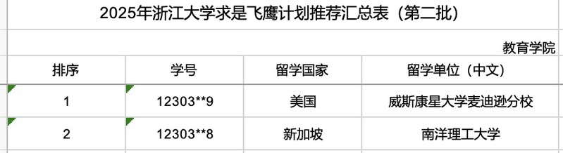 经学生本人申请、学院专家组评审通过,2025年浙江大学求是飞鹰计划推荐汇总表(第二批)拟推荐名单公示,详见下表: