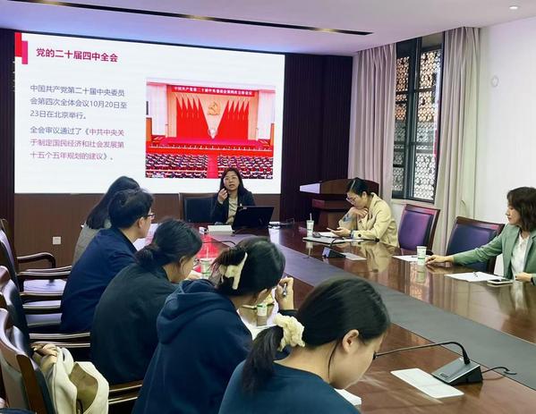 学院党委副书记崔倩领学了党的二十届四中全会精神。10月20日至23日,党的二十届四中全会在北京举行,审议通过了《中共中央关于制定国民经济和社会发展第十五个五年规划的建议》。崔倩指出,这次全会是在以中国式现代化全面推进强国建设、民族复兴伟业的关键时期召开的一次十分重要的会议。会议准确把握“十五五”时期党和国家事业发展所处历史方位,深入分析我国发展环境面临的深刻复杂变化,对未来5年发展作出顶层设计和战略擘画,必将对党和国家事业发展产生重大而深远的影响。崔倩强调,“十五五”时期是基本实现社会主义现代化夯实基础、全面发力的关键时期,具有承前启后的重要地位,全体党员要深刻领悟“两个确立”的决定性意义,增强“四个意识”、坚定“四个自信”、做到“两个维护”,在服务中国式现代化建设中贡献自己的力量。