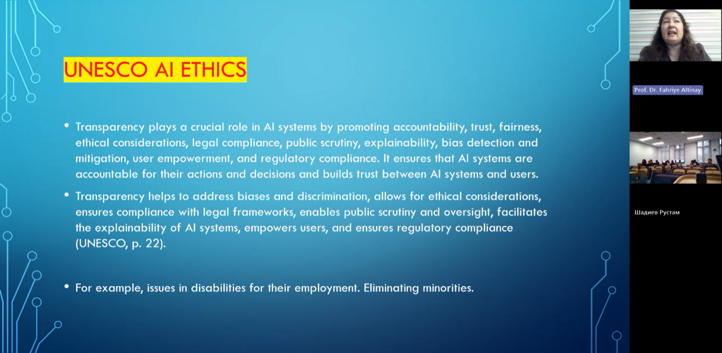 Altınay教授在讲座中深入探讨了人工智能在教育领域的伦理、文化与社会影响。她阐述了文化价值观与社会意识如何影响教育中的伦理决策与教学实践,强调教育应以包容、多元与全球公民意识为核心,尊重文化差异、促进公平共融。她指出,人工智能的发展应坚持“以人为本”的原则,注重透明、公正与平等,并将负责任地使用人工智能与联合国可持续发展目标(SDGs),如实现“包容且公平的优质教育”紧密相连。