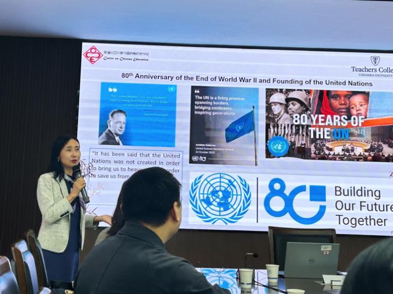 讲座伊始,程贺南教授指出,在世界反法西斯战争胜利及联合国成立80周年的历史背景下,重新审视教育在构建和平与正义世界中的根本性作用显得尤为重要。她援引联合国第二任秘书长达格·哈马舍尔德关于联合国宗旨的深刻阐述,强调教育不仅承载着传承文明、启迪智慧的重要使命,更在推动国际合作、维护持久和平方面发挥着不可替代的作用。她进一步指出,以哥伦比亚大学为代表的中美教育合作,正是这一理念的生动体现,在战后国际秩序构建与全球和平事业中作出了重要贡献。