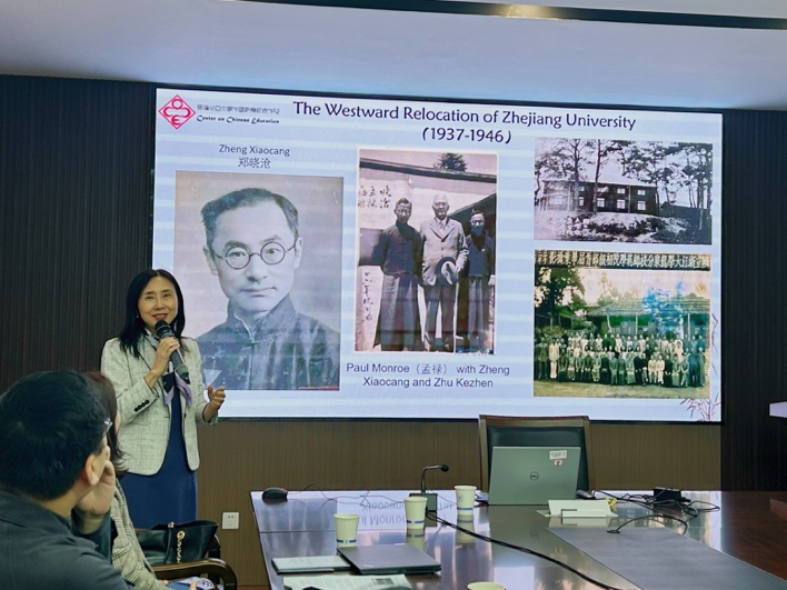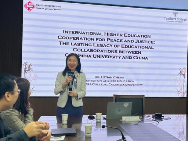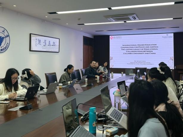 2025年10月12日下午,浙江大学教育学院“求是教育论坛”第114期在学院222会议室顺利举行。本次讲座邀请美国哥伦比亚大学中国教育研究中心执行主任、首席研究员程贺南教授担任主讲,作“促进和平与正义的国际高等教育合作:哥伦比亚大学与中国教育交流的史韵与薪火”(International Higher Education Cooperation for Peace and Justice: The lasting Legacy of Educational Collaborations between Columbia University and China)主题报告。浙江大学教育学院院长阚阅教授、党委副书记崔倩、“百人计划”研究员吴寒天、阮玉芳及部分硕博研究生参与活动。讲座由吴寒天研究员主持。
