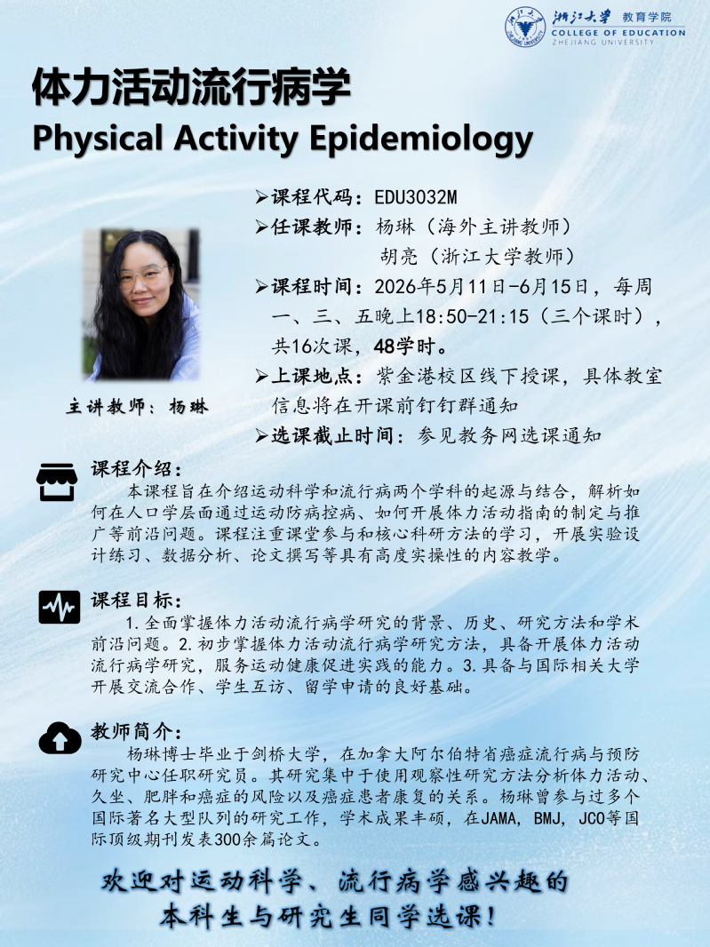教育学院2025~2026学年夏学期开设全英文课程《体力活动流行病学》,欢迎本科生选课!