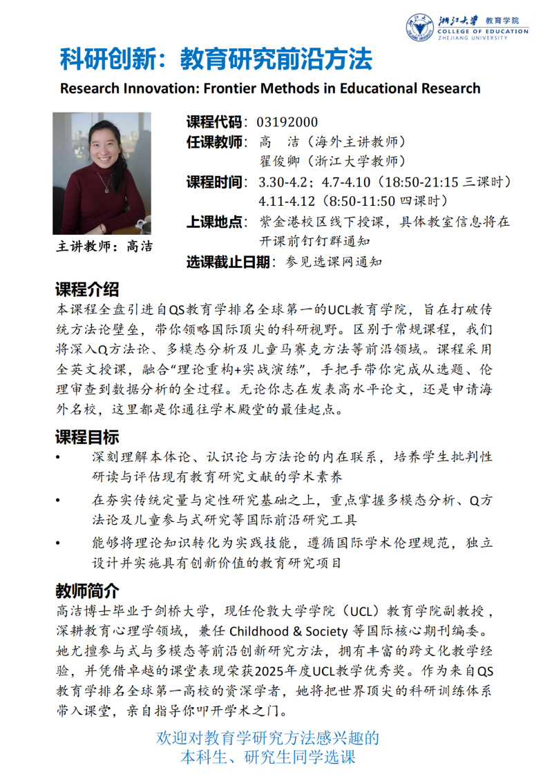 教育学院2025~2026学年春学期开设全英文课程《科研创新》,欢迎同学们选课!